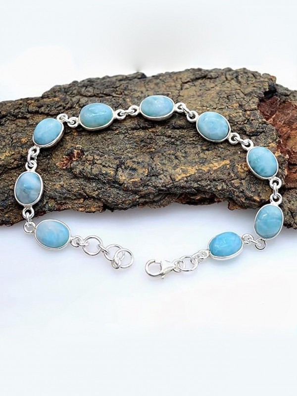 La pulsera de Larimar en Plata se distingue por su excepcional material. El Larimar, también conocido como "la piedra del Atlántico", es una gema azul única que se encuentra exclusivamente en la República Dominicana. Su tonalidad varía desde un azul celeste suave hasta tonos más profundos, creando una obra maestra natural en cada pieza. La plata, cuidadosamente seleccionada, resalta la belleza del Larimar y garantiza durabilidad y elegancia.